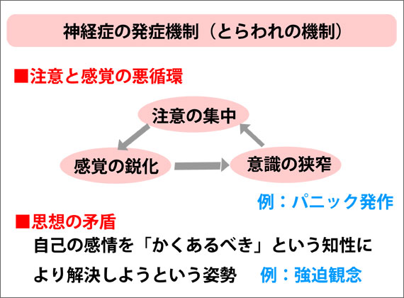 「とらわれの機制」には以下の2つが含まれます。第1は「精神交互作用」と呼ばれる機制です。例えば偶然の機会に心悸亢進が起こると、ことに神経質傾向にある人はそれに強い不安を覚えて心臓部に注意を集中します。その結果益々感覚は鋭敏になり、さらに不安がつのって一層の心悸亢進がもたらされるのです。精神交互作用とはこのように注意と感覚が悪循環的に作用して症状が増強する機制であり、パニック発作を生ずる心理的メカニズムもこの機制によって説明することができます。また心臓部に限らず身体のどこかに違和感を覚えたとき、神経質の人は過敏に病気を恐れてその部位に注意を向けます。その結果、一層違和感が強く感じられ、益々病気の恐れがつのっていくという悪循環は、心気障害に典型的な心理でもあります。さて、とらわれの機制の第2は「思想の矛盾」と呼ばれます。一般に神経質性格の人々は不安や恐怖などの感情や身体の感覚を「こうあるべき」「こうあってはならない」という知性でもって解決しようとする構えが強く、そこに不可能を可能にしようとする葛藤が生じるのです。例えば対人恐怖症(社交恐怖)の1種である赤面恐怖の患者さんは、何かの折りに人前で恥ずかしく感じ顔が赤らむといった当たり前の感情や生理的反応を「ふがいない」「もっと堂々としていなければならない」と考え、恥ずかしがらないように努める結果、かえって自己の羞恥や赤面にとらわれてしまうのです。特に思想の矛盾は、強迫的な心性に関連が深いと考えられています。
