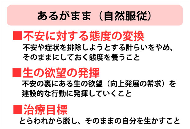 しかし実際にはそのままにおけば、不安は時間と共に自然に消褪することが事実なのです。ところで「あるがまま」の姿勢とは、不安をそのままにおくというだけではなく、不安の裏にある、よりよく生きていきたいという欲望(生の欲望)を建設的な行動に発揮していくことをも意味しています。