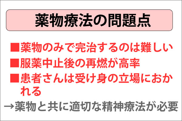 ところで今日では強迫性障害やパニック障害などの神経症に対して選択的セロトニン再取り込み阻害薬(SSRI)を始めとした薬物療法が普及しています。森田療法においても薬物療法との併用が広く行われています。但し薬物療法のみでは投薬の中止に伴う症状の再燃が高率に報告されており、また患者さんは受身の立場に終始するなどの問題点があります。森田療法の治療者は、薬物は神経症治療の補助手段であること、何といっても建設的な行動に向かう患者さん自身の取り組みが回復の原動力であると考えています。