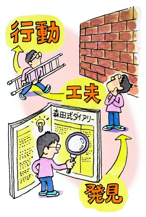 筆者は、はじめは一般的な日記指導を行っていましたが、その後1週間過ぎたら、まとめとして、新しく①発見したこと②工夫したこと③行動したことについて書き、さらに、それに対する感想も書くように指導を追加しました。そして、このまとめを見ていると、自己内省力が深まっていることに気づきました。そこで、さらに付け加えて、1週間ほどたったら、自分の日記を読み返し、自己コメントを書くことにより自学自修が出来るように工夫しました。このようなまとめを書くことで、①1週間におきた自分の変化状況を客観的に見つめることが出来るようになる。②まとめを発見、工夫、行動という3点に絞ったことで症状にとらわれた面より外向的で建設的な面に自然に目を向ける態度が身につく。③過去の変化を見つめることで今後の目標を立てることにも役立つ。そして、このような工夫を追加した日記を「森田式ダイアリー」と名付けました。
