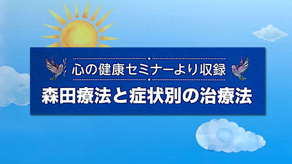 森田療法の入門講座内容と共に、神経症(対人恐怖症)、強迫症、パニック症、うつ病など代表的な4つの症状の解説と症状別の治療法を説明した内容。一般向けDVD。