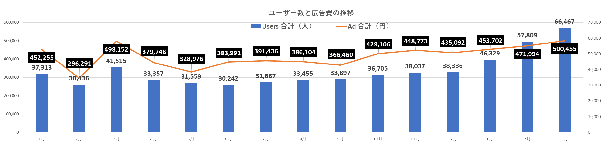 広告費とユーザー数の推移(令和6年1月~令和7年3月)